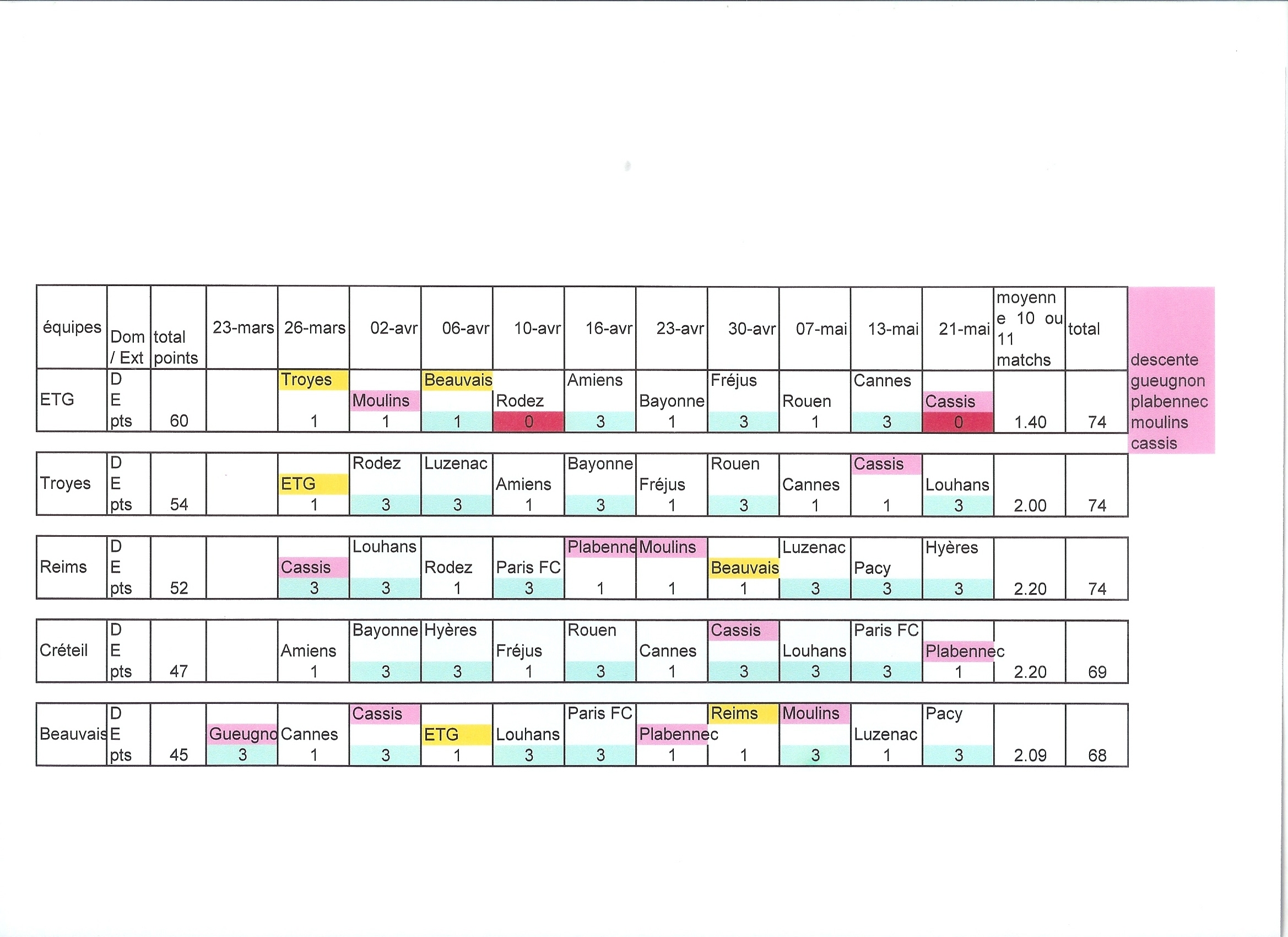 Considérons donc les matchs restant à disputer (une dizaine pour tous sauf + 1 pour Beauvais), et livrons nous à un exercice des pronostics avec comme hypothèses : un scénario volontairement « noirci » pour l’eTG (3V – 5N – 2D) et un second faisant plutôt la part belle aux autres prétendants. Le résultat serait que les 3 premiers actuels le resteraient et rejoindraient la L2 avec 74 points.